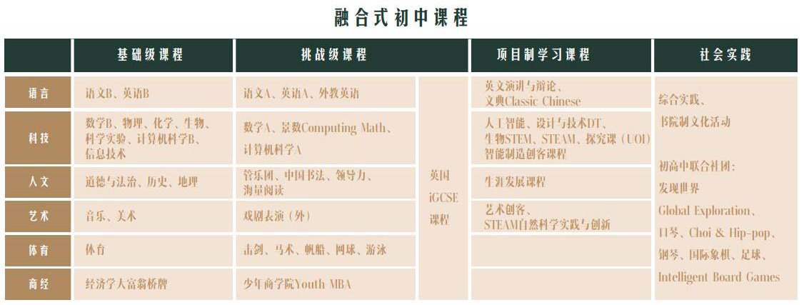 初中部全面貫徹中國教育部印發的《義務教育課程標準》《中小學綜合實踐活動課程指導綱要》以及《義務教育課程設置實驗方案》等指導性文件,開足開齊國家義務教育課程。其中,初三以校本課程方式提前開設英國iGCSE課程。除此之外,為滿足個性化教育和實現全人教育理念,以“學生成長為中心”,與國科大及國內外優質實踐學習中心整合打造豐富多彩且體現辦學價值的EFF(Education For Future)校本課程,包括Scratch/C/C++計算機編程、STEM課程、國學經典(含金陵文化)、土壤環境科學、植物科學、動物科學、創意藝術、空間藝術、綜合探究(UoI:Unit of Inquiry)、打擊樂器、游泳、網球、3D打印、DT設計與技術、物理實驗、化學實驗和生物實驗等40余門供學生自主選擇。重點培養學生的外語應用能力、科學實踐和創新能力、領導力與企業家精神、終身體育運動技能及運動社交、藝術氣質修養及藝術才能、信息能力等未來人才素養,旨在培養學生應對未來變化的全球勝任力。